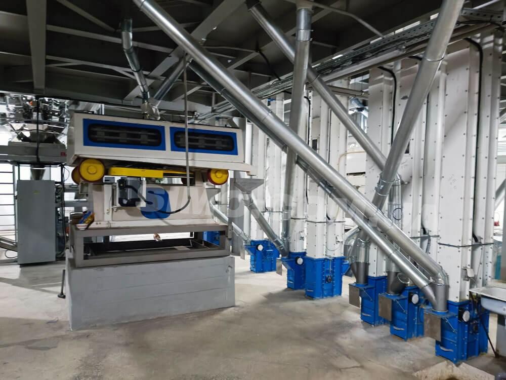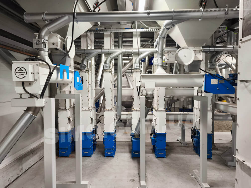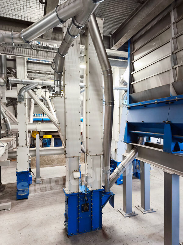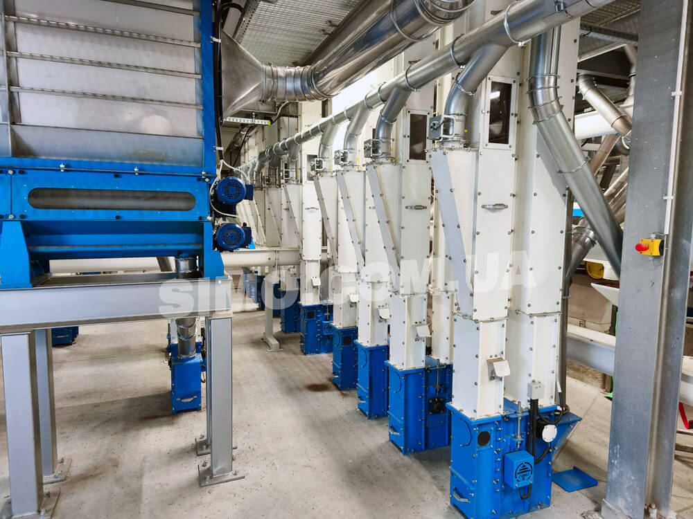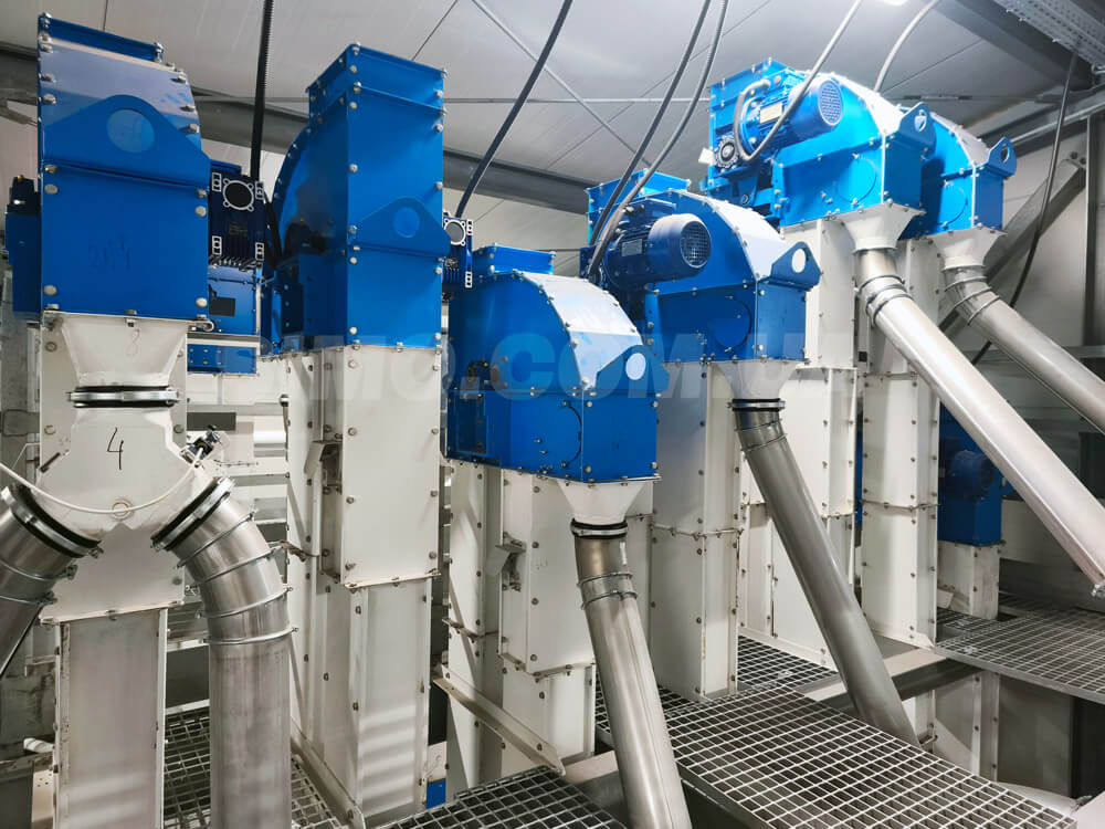 Grain through gravity pipes moves into inlet nozzle of bucket elevator. Then then picked up by buckets and lifted to a set height of the elevator top. Buckets discharge grain due to centrifugal acceleration. Afterwards, grain through gravity pipes goes to in accordance to the technological scheme.