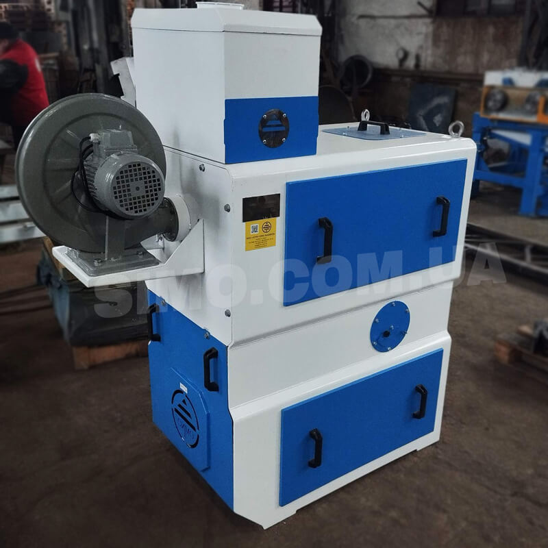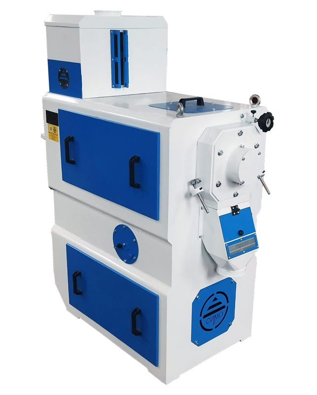 Aspiration is activated. Then the basic drive should be activated (in case the operator check successful work of aspiration and drive). The grain goes to the loading hopper. Afterwards, the grain supply is opened smoothly for dehulling at the same time the controlling the current load and the quality of product dehulling are carried out. Dehulled grain go out of the machine through outlet device completed with cargo valve. The husk and the bran flour are gone out through an aspirating casing. Aspiration is the most important for dehulling process. Specifically aspiration doesn't let the grain be overheated. The aspiration also delete small parts, which can interfere with grain dehulling.