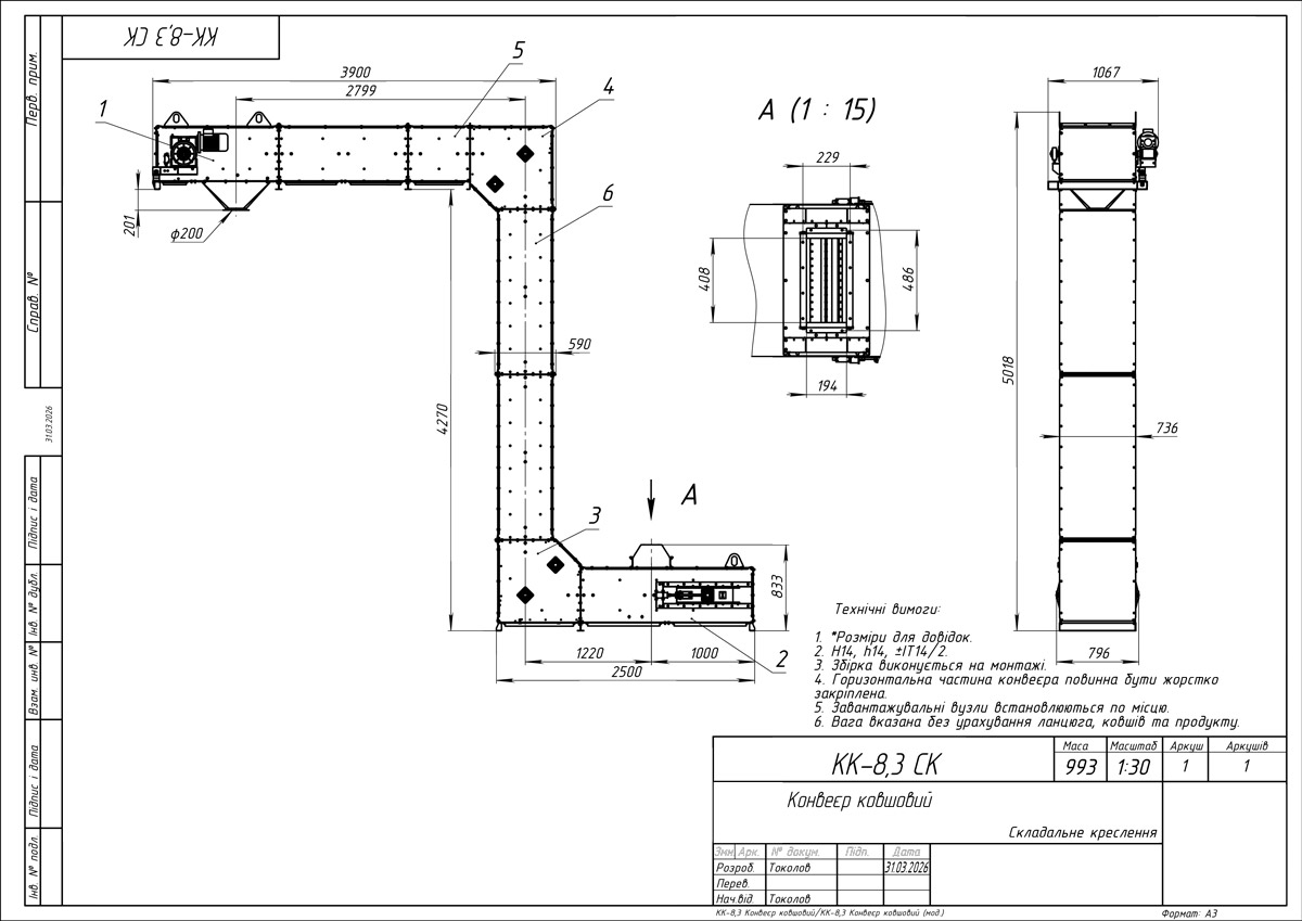 Конвейер ковшовой цепной КК10-8,3 предназначен для транспортировки зерна и продуктов его переработки. Изготовлен из конструкционной стали с порошковой покраской RAL 7046. Высота загрузки/выгрузки 350 / 5 500 мм с возможностью регулировки 50 мм.