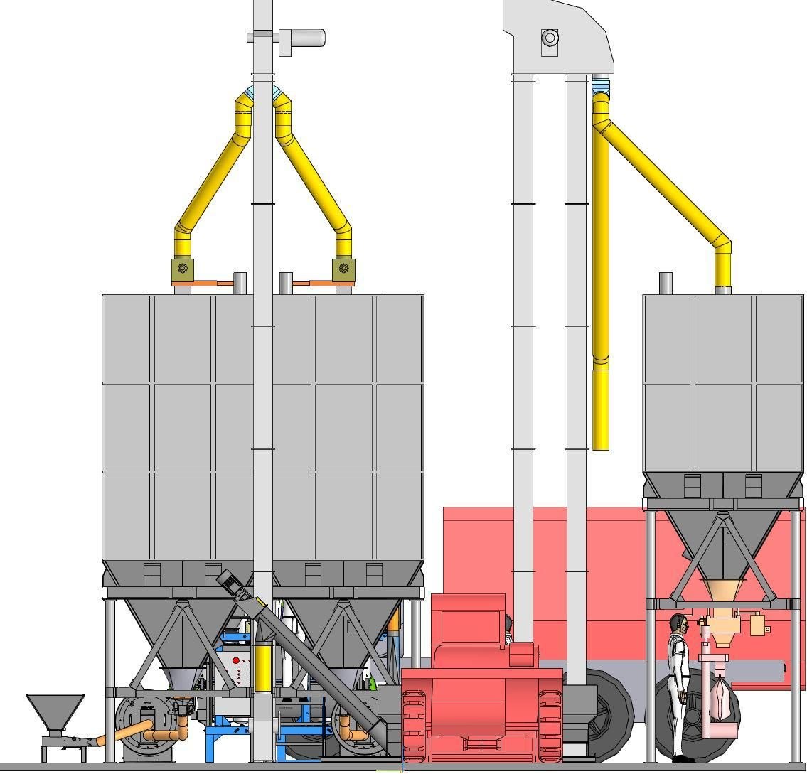 - После ввода 6-и компонентного рецепта в память блоков индикации веса пневмозаборник устанавливается в первый бурт сырья или подсоединяется к бункеру с первым компонентом. Включается дробилка. Дробилка с помощью пневмотранспорта проводит забор сырья, его измельчение и транспортировку в накопительный бункер, который является одновременно циклоном-разгрузителем и весами.