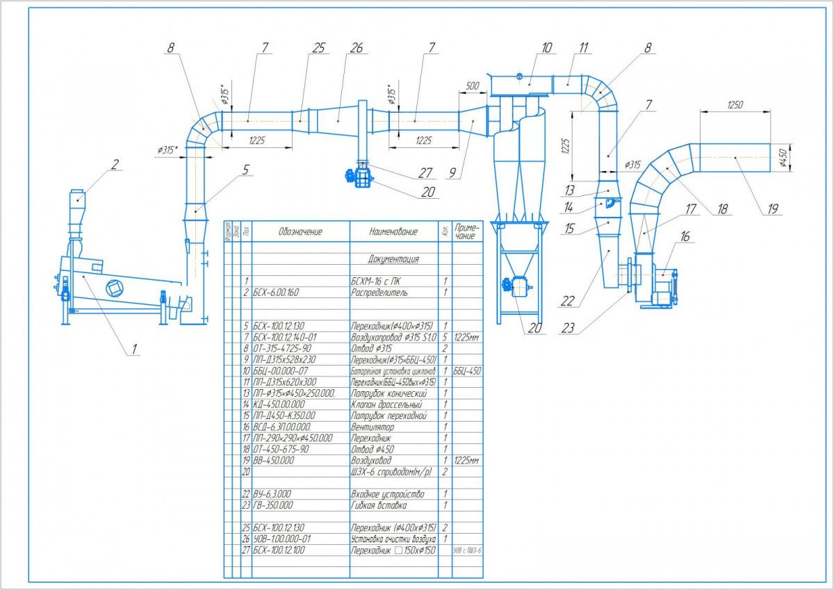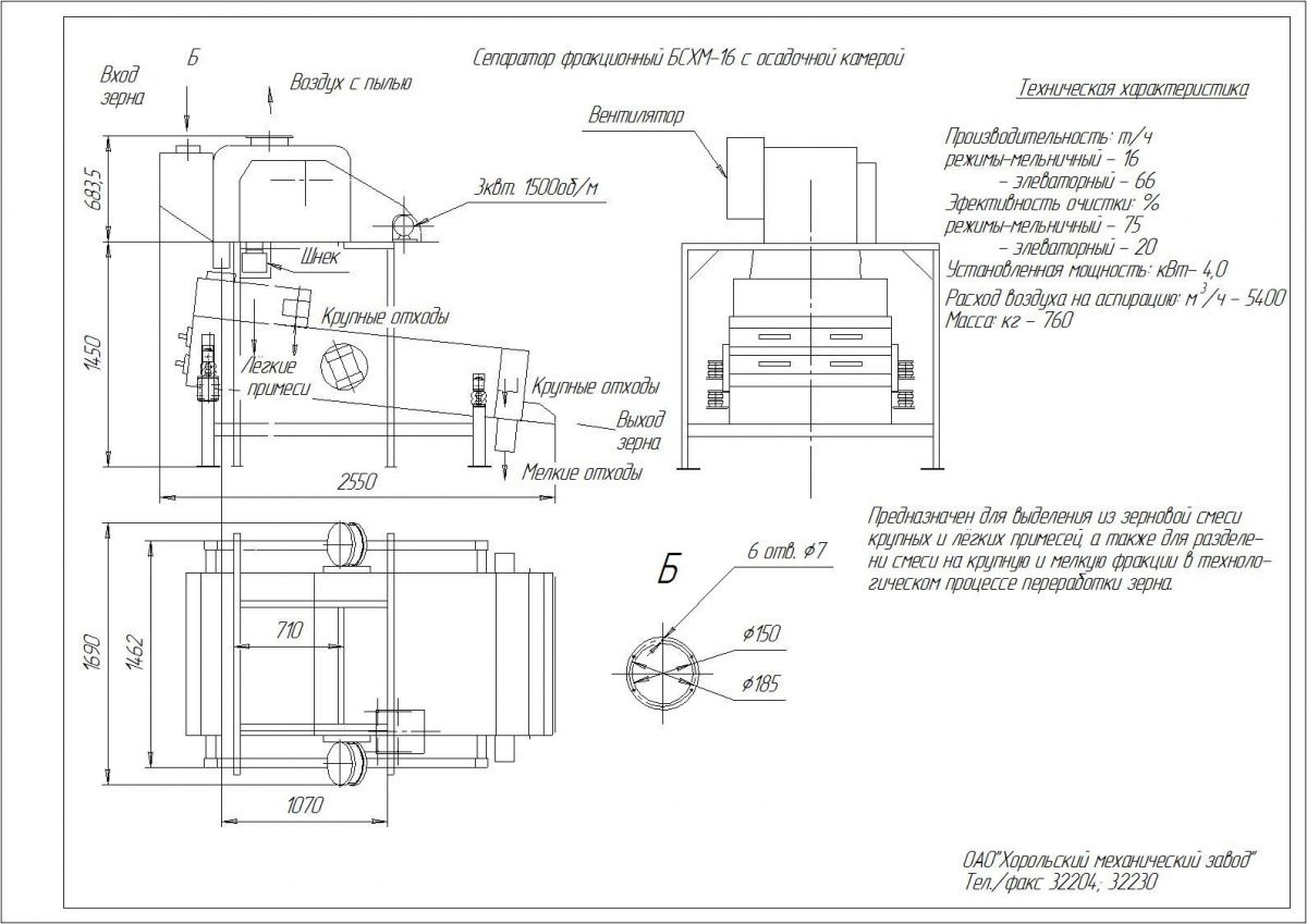 Сепаратор фракційний з пневмоканалом БСХМ-16 (рис.1.) Складається з сепаратора для відділення крупних домішок і поділу вихідної зернової суміші на фракції, і пневмосепаратуючого каналу для відділення легких домішок і пилу. Сепаратор складається з наступних вузлів: станини, приймального пристрою, кузова з ситовими рамками, випускного пристрою.