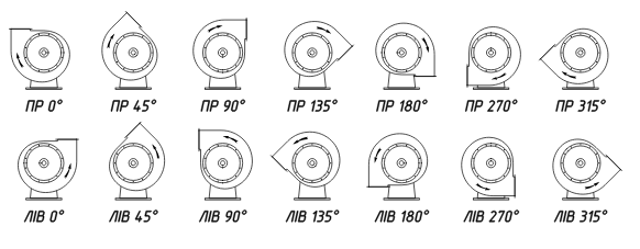 Напрям корпусу вентилятора відповідає напряму обертання робочого колеса і визначається З БОКУ ВСМОКТУВАННЯ ПОВІТРЯ: обертання ПРАВЕ - якщо спіраль улітки направлена ЗА годинниковою стрілкою; обертання ЛІВЕ - якщо спіраль улітки направлена ПРОТИ годинникової стрілки.
