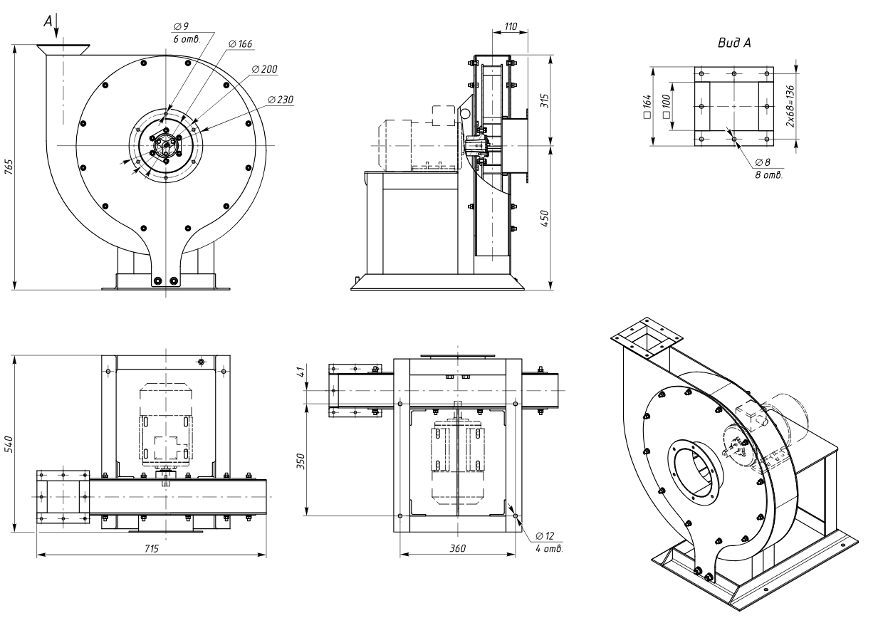 - Станина вентилятора (рама). Станина металева, зварна. До неї кріпляться всі основні вузли відцентрового вентилятора. Для кріплення до монтажної поверхні в рамі передбачені отвори, які також можуть бути використані для установки вентилятора на віброізолятори.